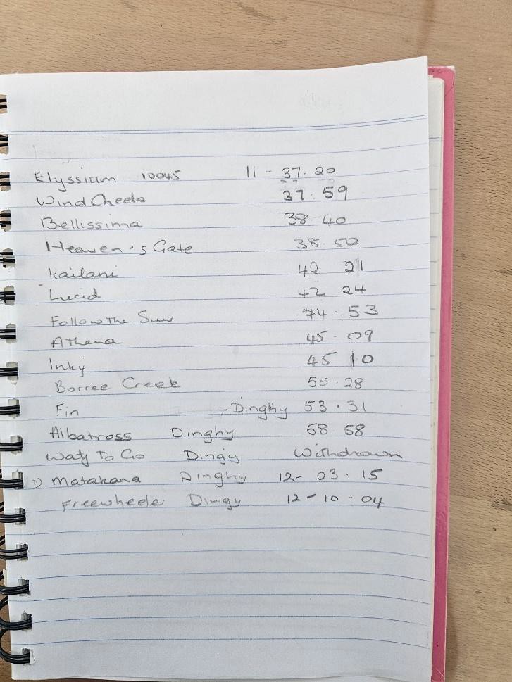 Below are the results. The event started at 10 am and the results count from 11 am (the winner taking 1 hour 37 minutes and 20 seconds. 39 seconds behind was Wind Cheetah, then 41 seconds to Belissima and 51 seconds to Heavens Gate and so on. Note the 3 seconds between Kailani and Lucid and the 1 second between Athena and Inky with Follow the Sun squeezed in between those 4. Note also where the ‘dinghy draggers’ came and where they might have come had they not dinghy