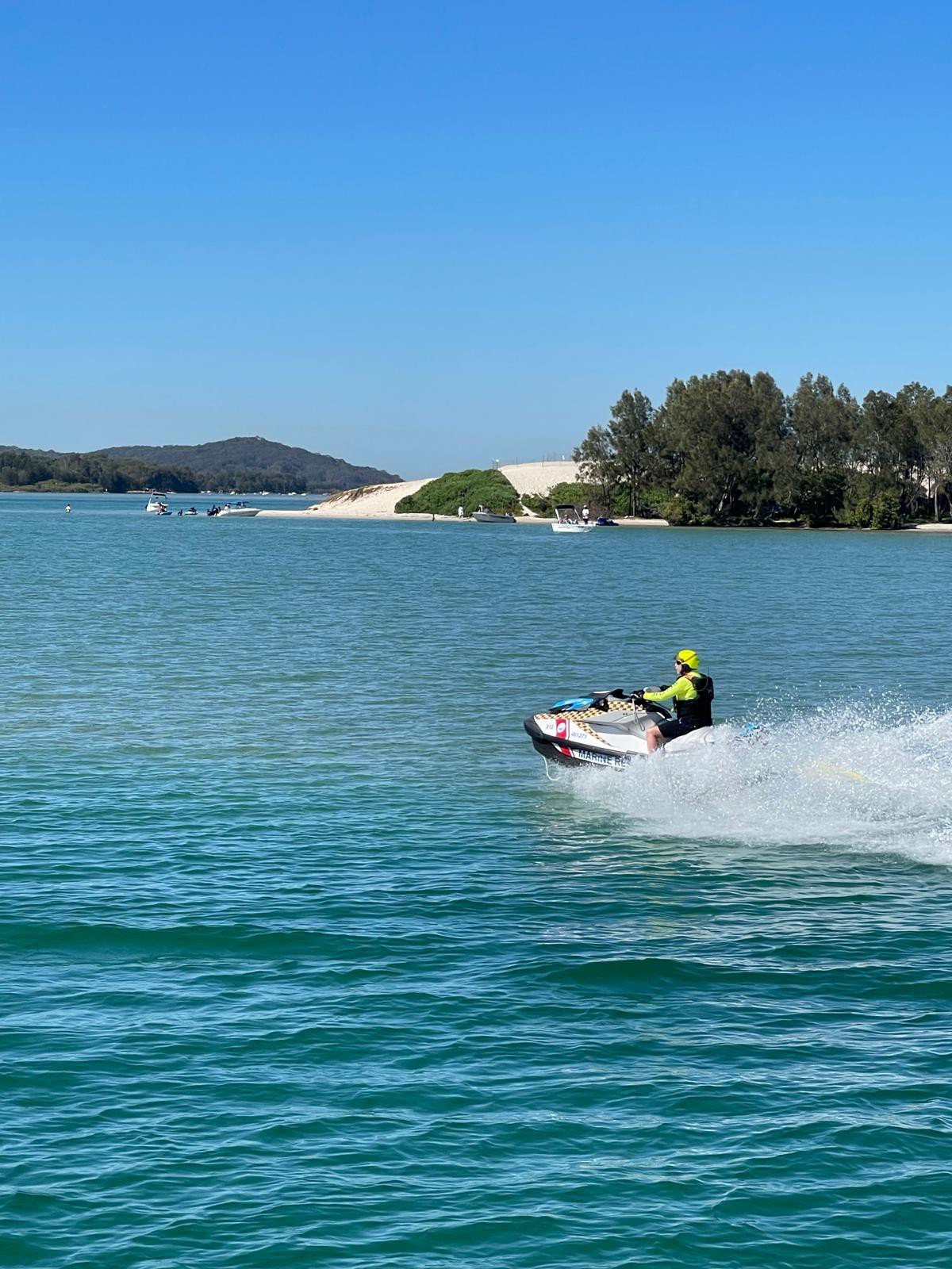 the shallower draught going before a deeper draught boat. This was so that if a boat with a deeper draught became stuck on the sand they did not create a log jam. Fortunately this did not happen to any of us. After the bridge, marine rescue continued to monitor our progress using a jetski and guided us to the leads to cross the bar.