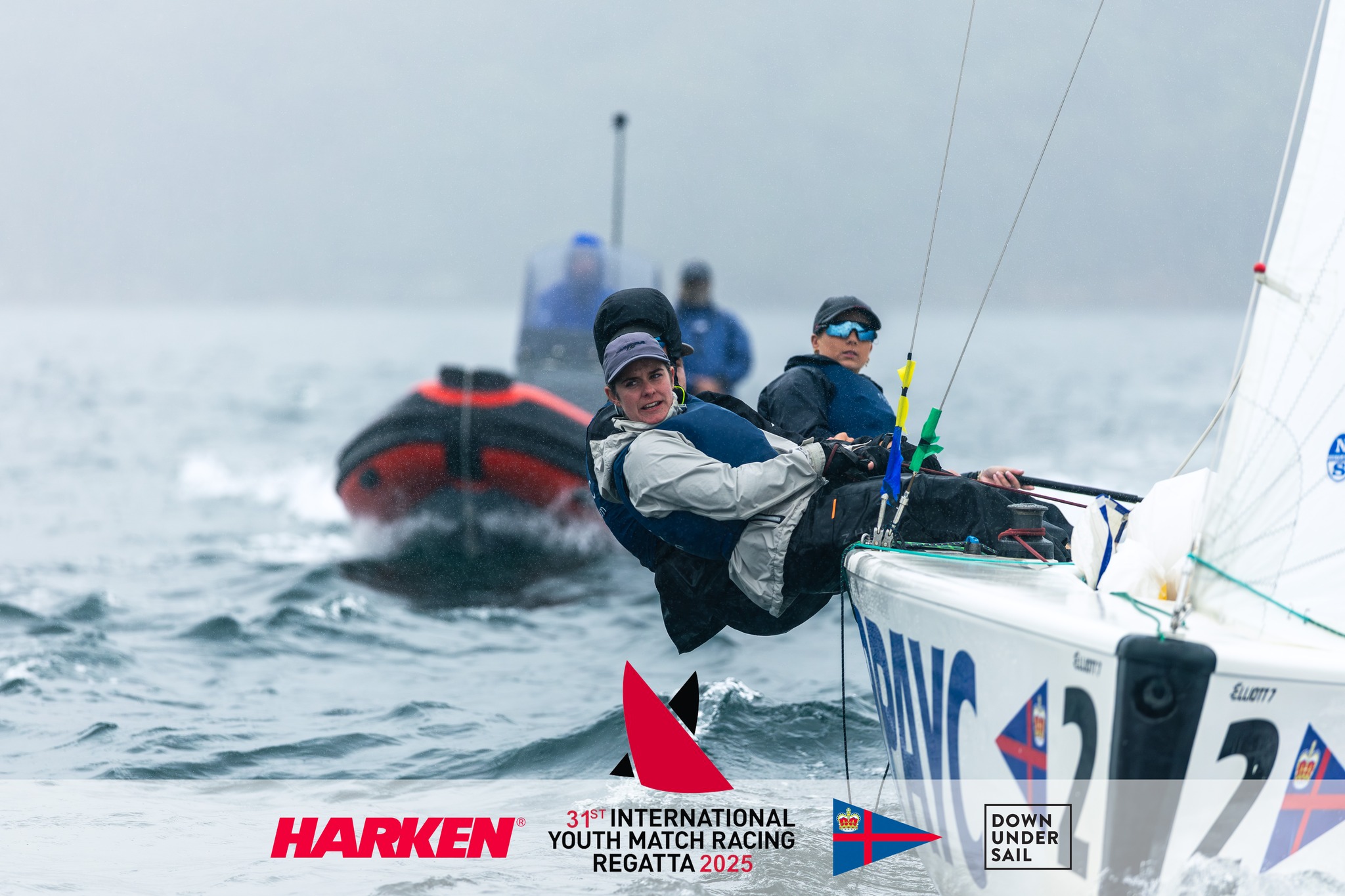 Day 2 of the 2025 Harken International Youth Match Racing Championship unfolded under a moody Pittwater sky, with rain and a firm southerly breeze shaping another day of match-racing.