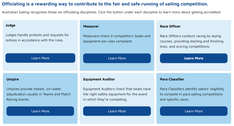 The officiating streams within Australian Sailing are split into the following programs: