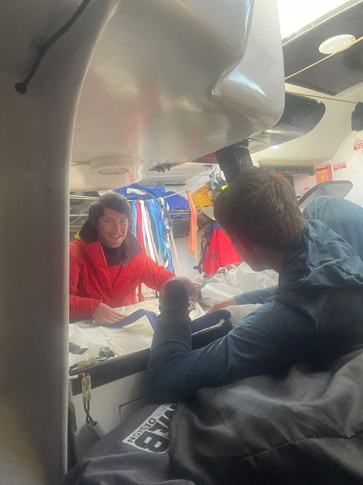 “We had a lovely day sailing yesterday, initially with our FRO ((Fractional Code 0) up, then our repaired A2 (see pic of repairers hard at work). Then we went back to the FRO in the late afternoon and we still have it up.”