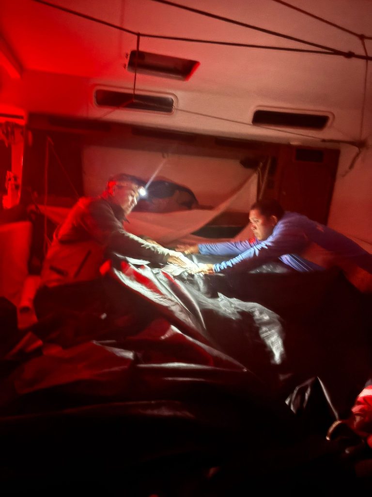 “A nice fast and dark night last night in 15 to 22 knots, with boat speeds between 20-25 knots at 125 True Wind Angle. It’s a little damp on deck at times and we had a small issue with one of our mainsail batten boxes which took around 30 minutes to fix.,” Jono Rankine said from Lucky.